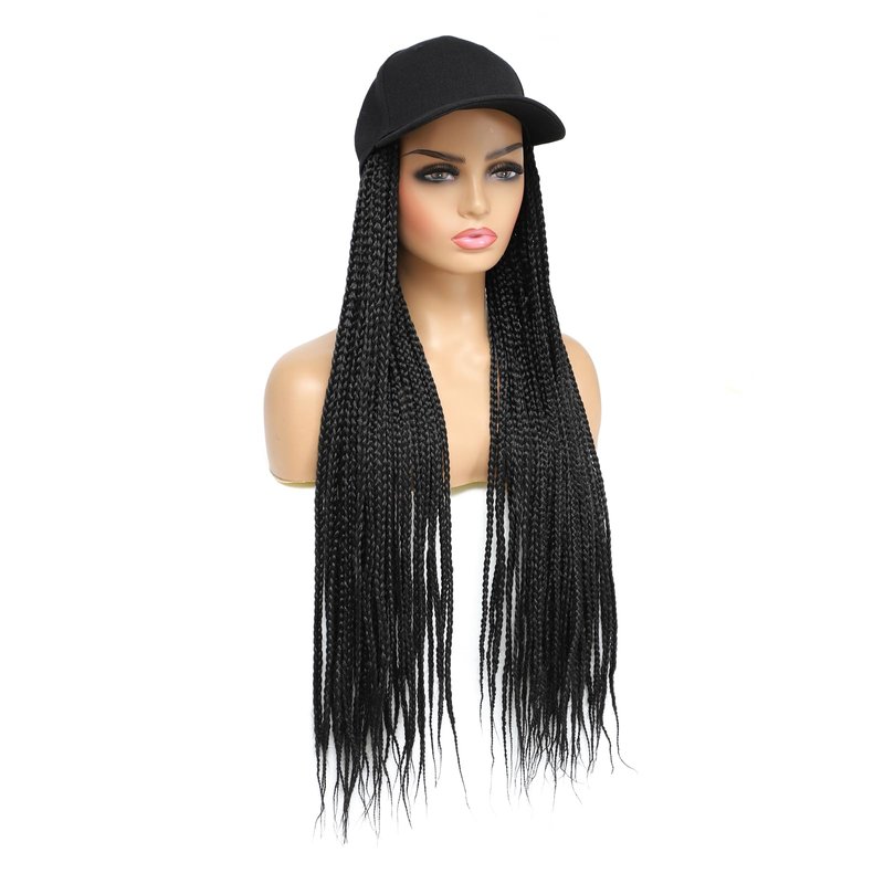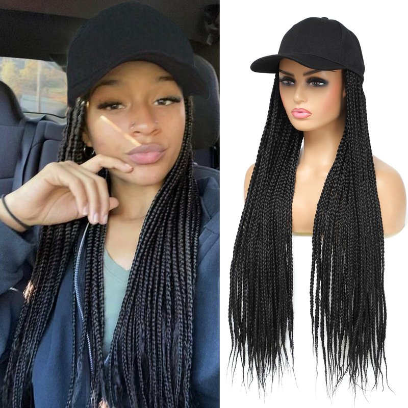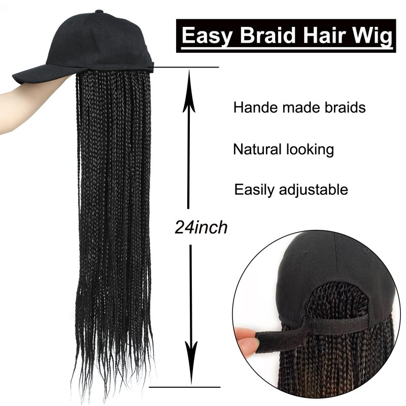 Yunkang Braided Baseball Cap Wig Box Braid Hair Extensions with Hat Ombre Color Synthetic Hair Cap Wig with 24inch Long Braiding Hair for Women (B-Black)