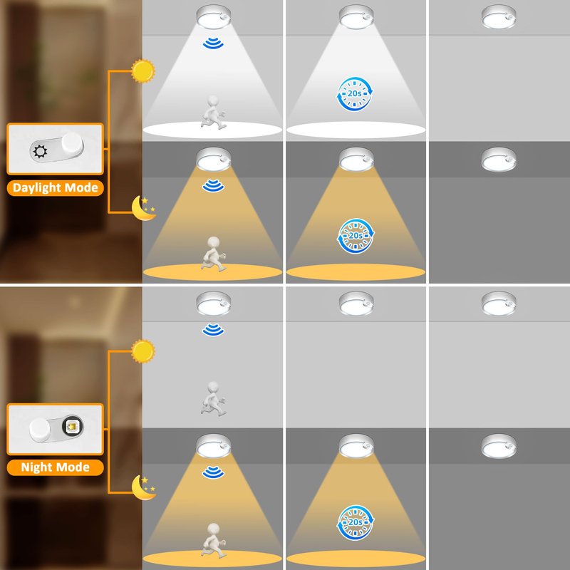 - 【Motion Sensor / Remote Control】- Battery powered ceiling light has a built-in motion sensor and infrared sensor. ① Motion Sensor Mode: The light will be automatically activated by motion when you are within 18ft. ② Remote Control Mode: You can also control the light manually by remote control to make it turn on/off at any time. off automatically after 20 seconds when no motion detected, reducing power waste.