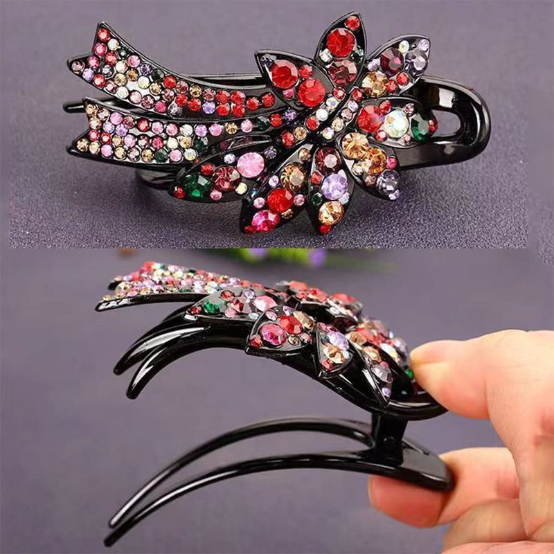 - Jeweled Hair Clips Material: Made of selected flexible plastic, will not damage the scalp and hair. Hand set with shiny rhinestones that won't fade and can be worn in the shower. Light weight, strong clamping force, will not fall, suitable for long time use.