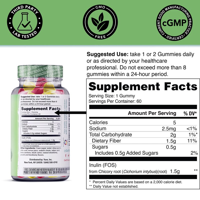 Yuve Prebiotic Fiber Gummies - Delicious - 3g Soluble Fiber Supplement - Supports Digestive Health & Regularity - Vegan & Gluten-Free Fiber Gummies for Adults & Kids - Non-GMO & Low Sugar - 60 Count