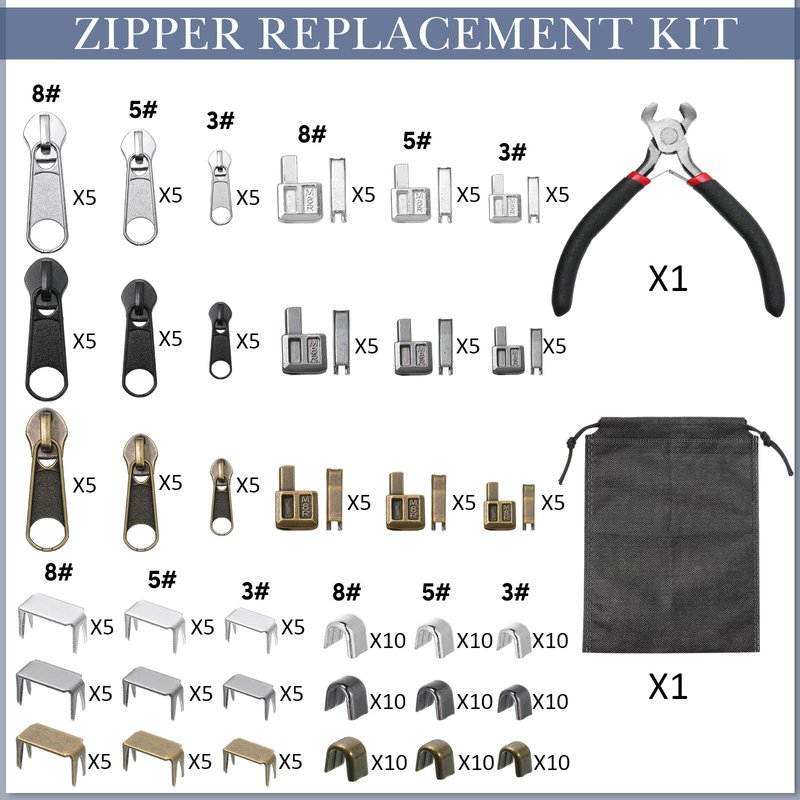 - Quantity and Size Information: there are a total of 272 pieces of zipper replacements repair kit, including 15 pieces of silver sliders (#3 #5 # 8), 15 pieces of black sliders (#3 #5 # 8), 15 pieces of bronze sliders (#3 #5 # 8), 45 pieces of bottom stops (#3 #5 #8), 90 pieces of top plugs (#3 #5 # 8), 90 pieces of zipper pins, 1 piece of zipper install plier and 1 piece of storage bag; A complete and considerate combination to meet your various demands