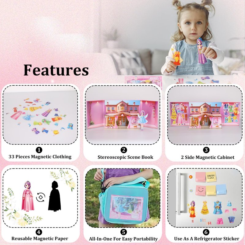 - Paper Dolls House: The magnetic dress up doll not only has rich magnetic stickers, but also comes with 3D magnetic game interactive scenes of castle and garden. Cultivate children's attention and patience