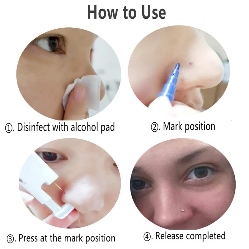 - 【Easy to use】Just aim at the marked piercing, press hard on the piercing gun, you will hear a clicking sound, your nose will be pierced, the nose stud will stay at the marked position, and the plastic on the nose stud will come off by itself, Puncture completed