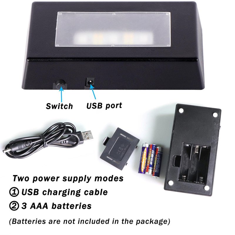 The light base has two models of power supply, one is using 3 AAA 1.5V batteries, another one is using the charging cable (the package doesn't include battery and plug), you can use the cable to connect the computer, car or portable charger.