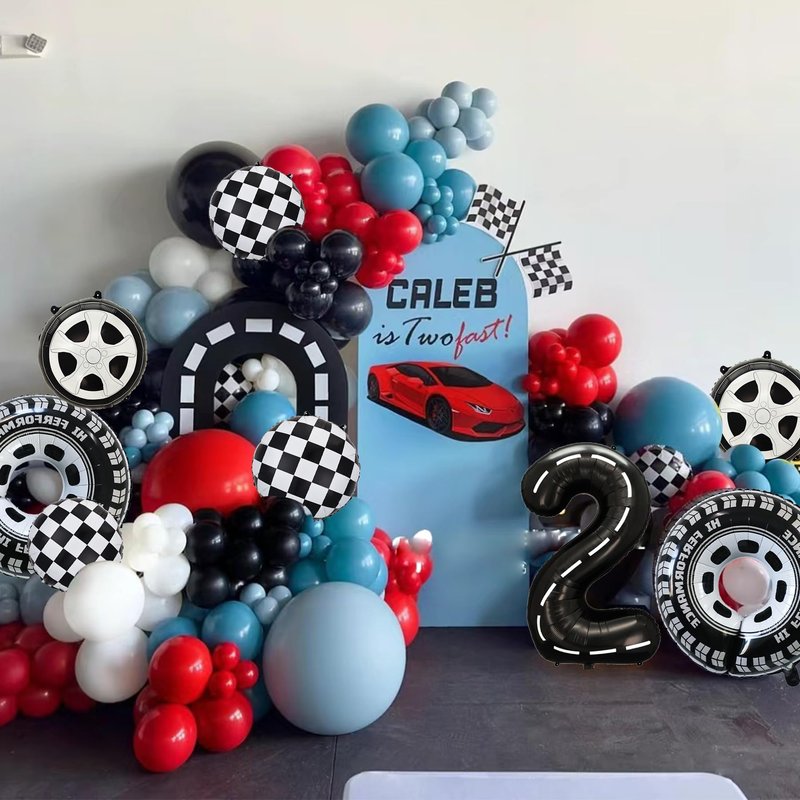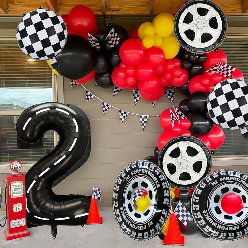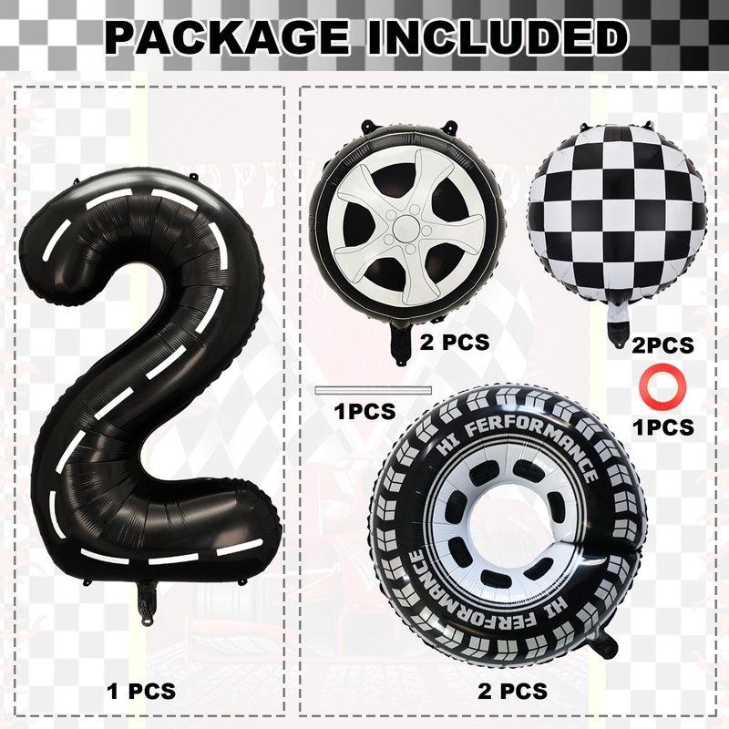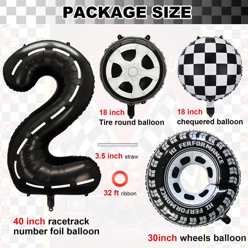 - Package included :1pcs 40 Inch foil mylar racetrack number balloon 2,2pcs 29 Inch wheels foil mylar balloons,2pcs 18 Inch black and white chequered round balloons,2pcs 18 Inch Tire round balloons,1 pcs ribbon,1 pcs straw.