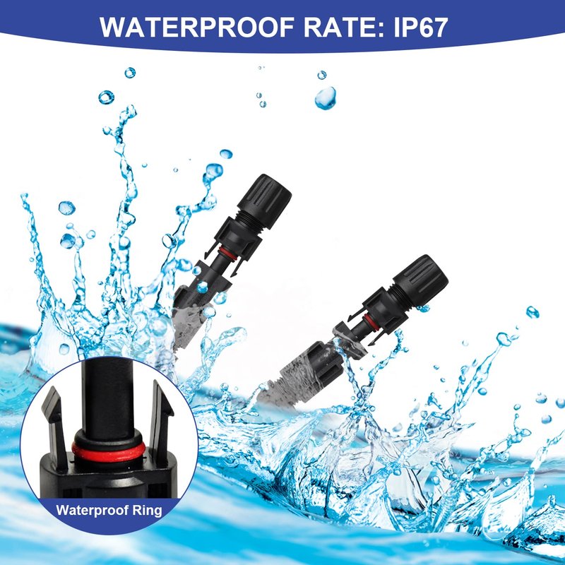 - 【SOLAR CONNECTORS】Compatible with PV cables 2.5/4/6 m㎡(14,12,10AWG). 1000V DC rated voltage and IP67 water proof level. With water & dust proof is safe for electrical connection. Easy to connect & disconnect with stable self-locking mechanism.