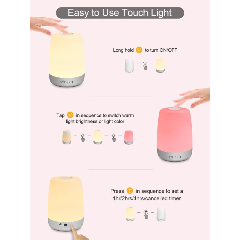 - Easy To Use Portable Night Light >>> Touch button on the top: long touch to turn on/off, single tap for brightness adjusting or color switching.YYDSKIT warm light lamp is simple operation. You don't need to read the manual, really friendly to kids or seniors.The foldable hook makes YYDSKIT bedside light easy to carry wherever you go.