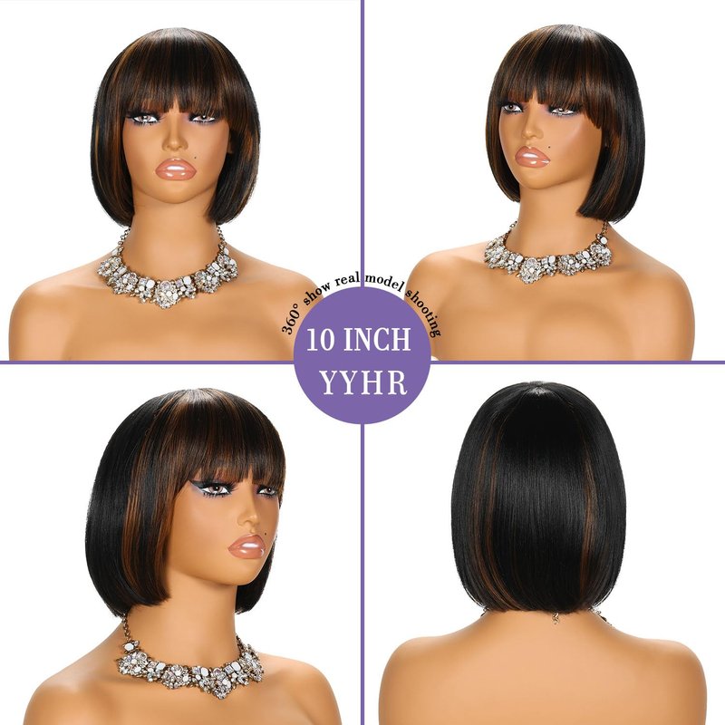 YYHR Short Bob Wig With Bangs 10" Black Mix Brown Yaki Straight Hair Daily Costume Wig Soft Light Synthetic Hair Replacement Wigs Heat Resistant (10 Inch, F1B/30)