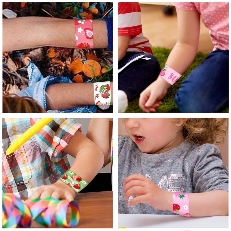 - Strawberry Birthday Party Decoration: These slap bracelets have assorted colors and will be easy to match with your party outfit and these wristbands are made of safe and harmless materials, which is safe for children to wear, not easy to break or fade ,light and portable, you can wear it for a long time