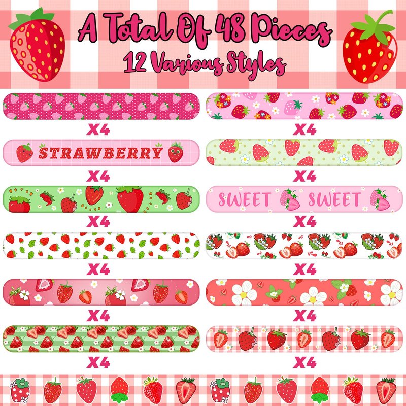 - Strawberry Party Favors: 48 pieces of strawberry slap bracelets are cute and full of pink, red, sweet strawberry, white little daisy and green elements, 12 strawberry designs with cute pattern and bright colors, 4 of each color and style, the quantity and color are enough for your different decorations