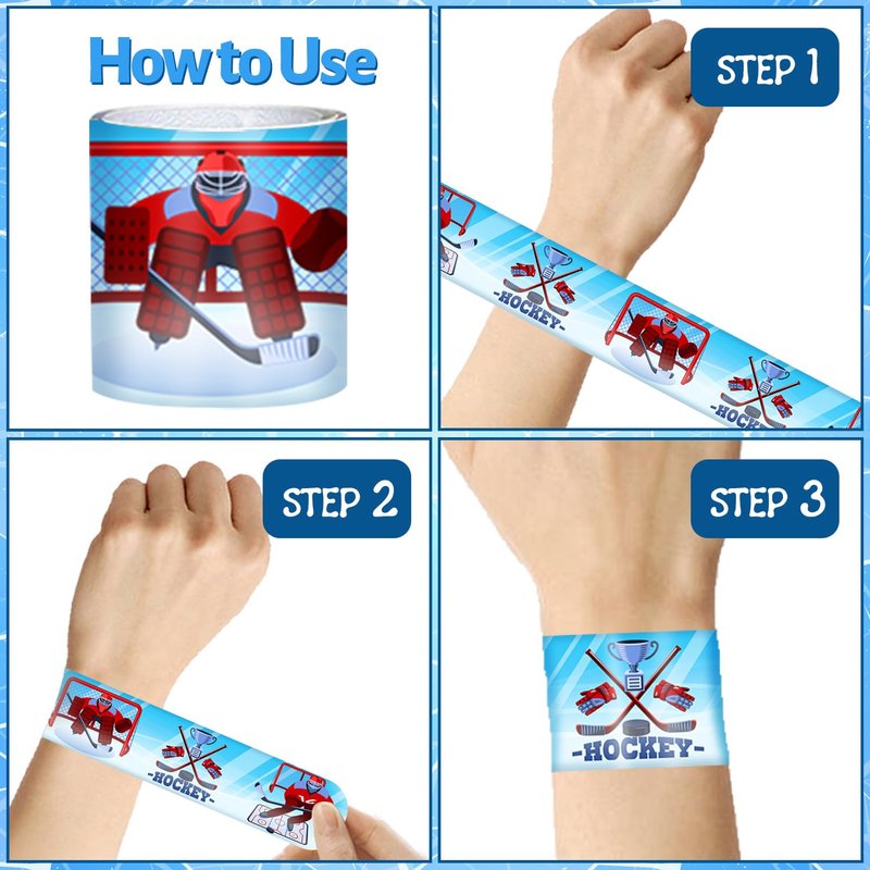 - Ice Hockey Slap Bracelets: Ice hockey bracelets are made of safe and harmless materials, strong and durable, will not scratch your skin, very safe for children. Put ice hockey bracelet on your wrist and press lightly, and it will form a comfortable circle and wear it firmly on your wrist. The ice hockey birthday decorations are printed with various ice hockey theme patterns to make your ice hockey party more attractive