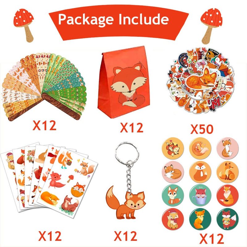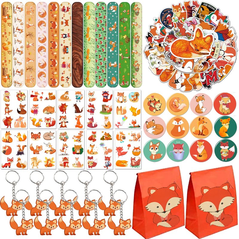 - PACKAGE INCLUDE: Fox party favors includes 12pcs fox slap bracelets,50pcs fox stickers ,12pcs fox key chains, 12pcs fox badges ,12pcs fox gift bags,12 sheet temporary tattoos (72 Patterns),Enough quantity to meet your fox party needs