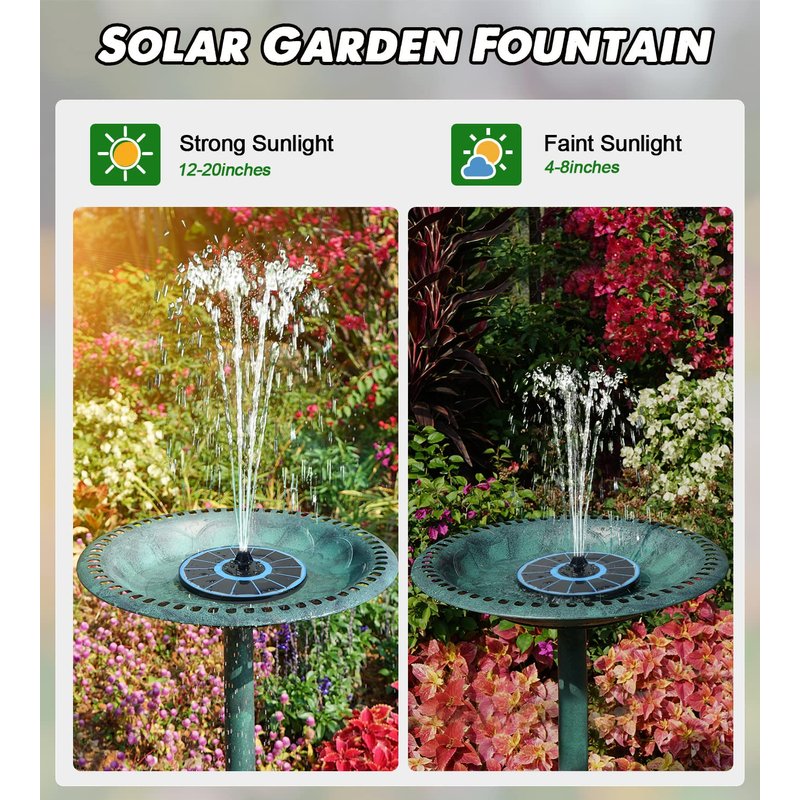 - โฒ๐๐ข๐ ๐ก ๐๐จ๐ง๐ฏ๐๐ซ๐ฌ๐ข๐จ๐ง ๐๐ฅ๐๐ฌ๐ฌ ๐๐๐ง๐๐ฅ & ๐๐๐ฌ๐ฒ ๐ญ๐จ ๐๐ฅ๐๐๐ง: Our upgrade solar fountain for birdbath is made up of a high-quality full glass panel. Compare with the plastic panel solar powered fountain, our glass panel solar fountain is higher light conversion efficiency and is stable. The intensity of sunlight will affect the spray height of the fountain, the normal height is 12-20inches, the fountain height is automatically adjusted to 12inches/30cm at night). Also, smooth glass panel is easier to clean.