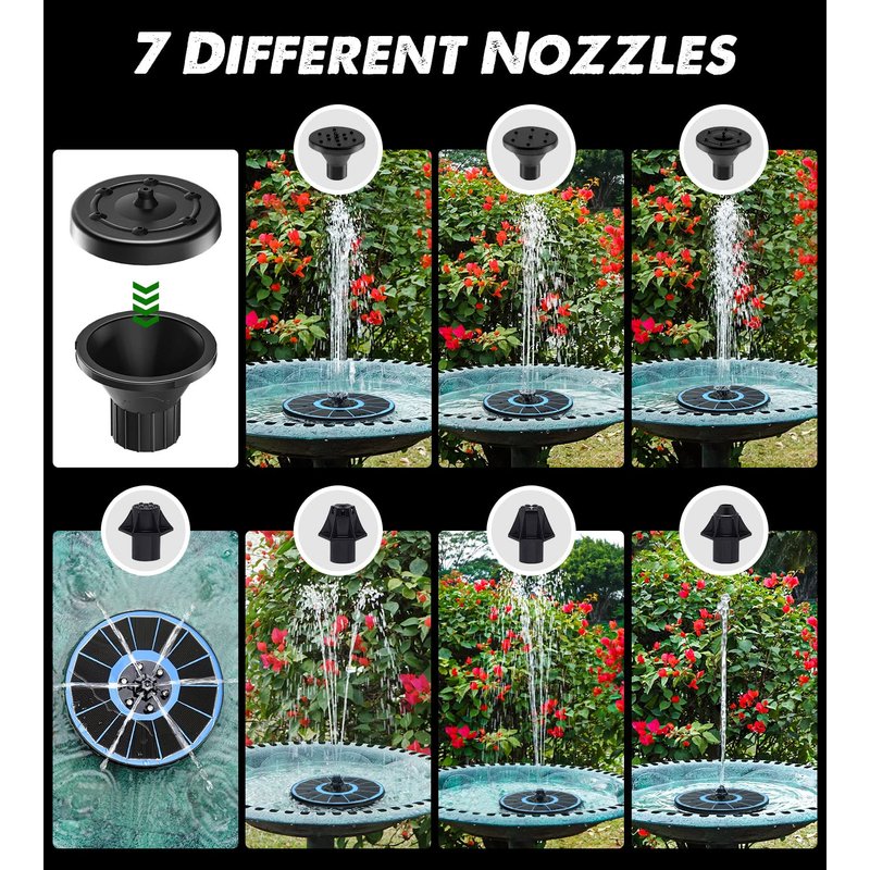 - ๐ฆ๐๐ง๐ญ๐ข-๐๐ซ๐ข๐๐ญ ๐๐๐ฌ๐ข๐ ๐ง: The package comes with a 6.3 inch solar fountain, 8 nozzles, 4 *5 fixed rods and 3 filter cotton. Do you worry about the solar fountain swing around the birdbath and spray outside? The fixed rods are better prevent the solar fountain from moving randomly. With 8 nozzles, you and your family can enjoy 8 fountain style. Solar bird bath fountains perfect for pond, pool, outdoor, patio, garden decoration, kids playing and animal drinking