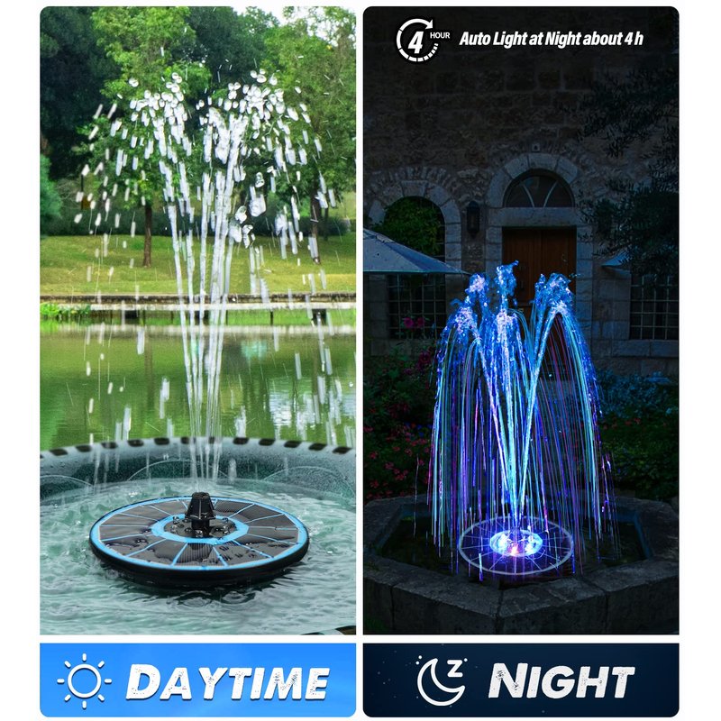 - ๐๐๐จ๐ฅ๐จ๐ซ๐๐ฎ๐ฅ ๐๐๐ ๐๐ข๐ ๐ก๐ญ ๐๐จ๐ฅ๐๐ซ ๐ ๐จ๐ฎ๐ง๐ญ๐๐ข๐ง:3.5W solar water fountain for birdbath is equipped with 6 LEDs. The RGB colorful led light will auto light up at night. With 2200 capacity battery, the solar fountain with battery fully charge will provide power for about 3 - 4 hours working at night. During the day, the solar fountain will attract all kinds of birds, like hummingbirds. At night, you and your family can enjoy the wonderful light show. Go and buy our amazing solar fountain with colorful light to decorate your Garden.
