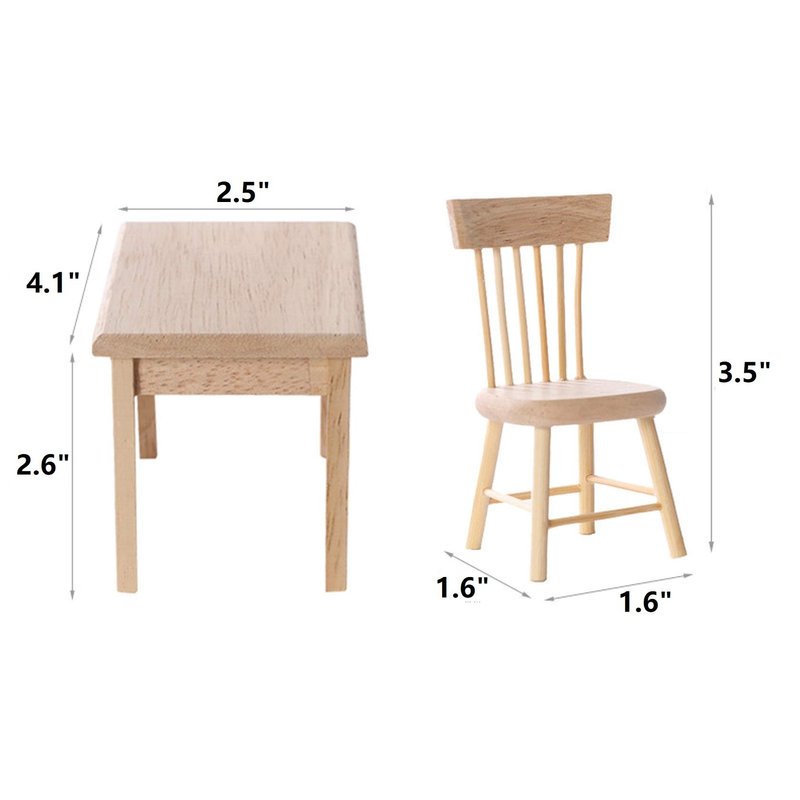 Dimensions: chair - 3.5*1.6*1.6 inches; table - 4.1*2.6*2.5 inches.