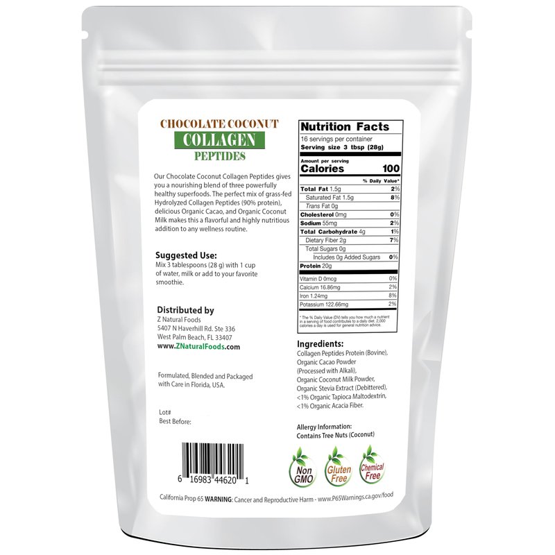 - Protein Powerhouse: Z Natural Foods Chocolate Coconut Collagen Peptides are rich sources of high-quality protein derived from grass-fed hydrolyzed collagen. Our delicious blend, made with collagen, is renowned for its nourishing and healing properties.