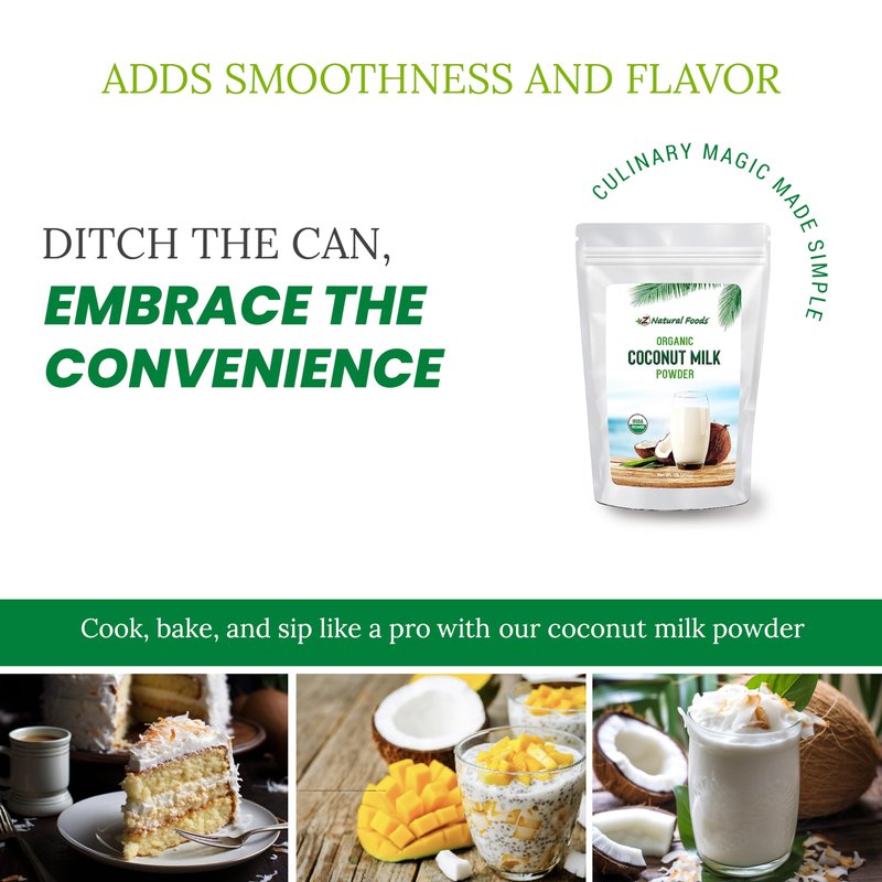 indulge in the goodness of pure coconut milk in a convenient powder form with Z Natural Foods' exceptional offering. Our coconut milk powder boasts a treasure trove of nutrients, including high-quality fats, calcium, vitamins, and a protein punch, which is perfect for people who are sensitive to nuts, lactose sensitive, or allergic to casein. Crafted with precision, our coconut milk powder is slow-dried, allowing it to retain all the naturally occurring enzymes and nutrients while giving it a delicious taste. The powdered milk is GMO-free, hormone-free, gluten-free, and kosher-certified. Embrace the versatility of Z Natural Foods Coconut Milk Powder in your culinary endeavors. From baking to cooking, from invigorating your morning cereal to perfecting your coffee or tea, the possibilities are endless. Preparing a cup of liquid milk is a breeze; just mix 1-2 tablespoons of our milk powder with 1 cup of warm water and relish the rich, creamy taste that will leave you wanting for more.