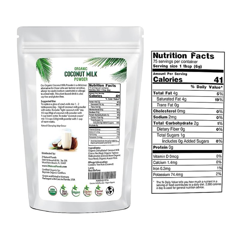 - Packaging Details: Z Natural Foods Coconut Milk Powder ensures essential nourishment for the whole family. This milk powder is available in three different sizes - 1 lb, 5 lbs, and 33 lbs.
