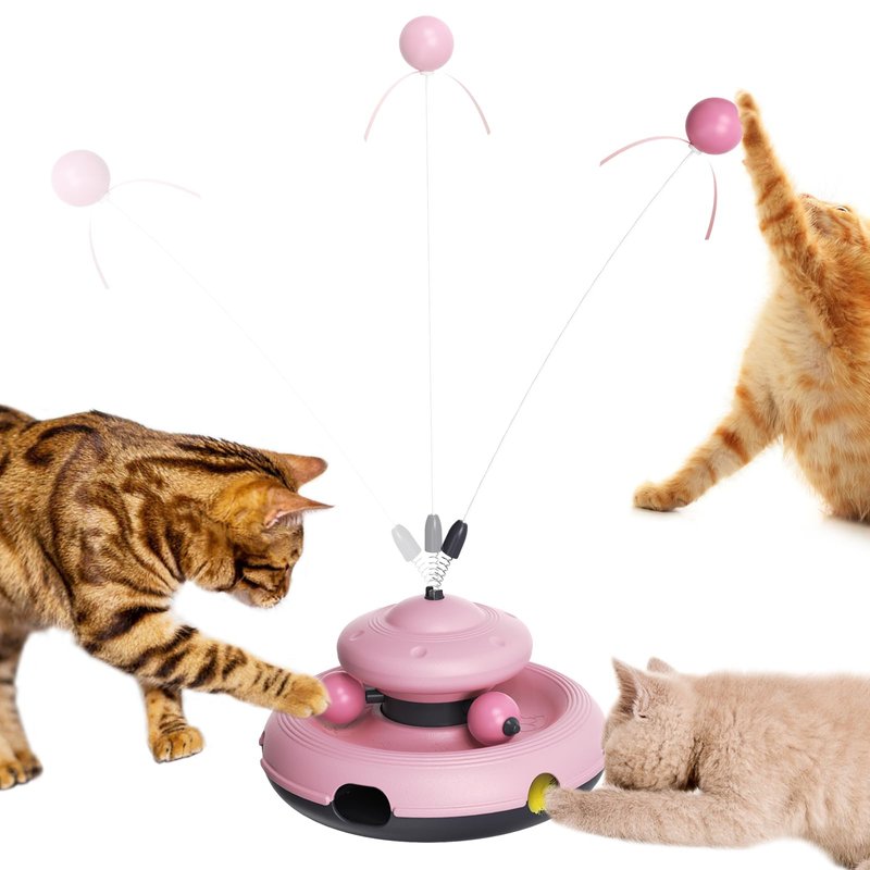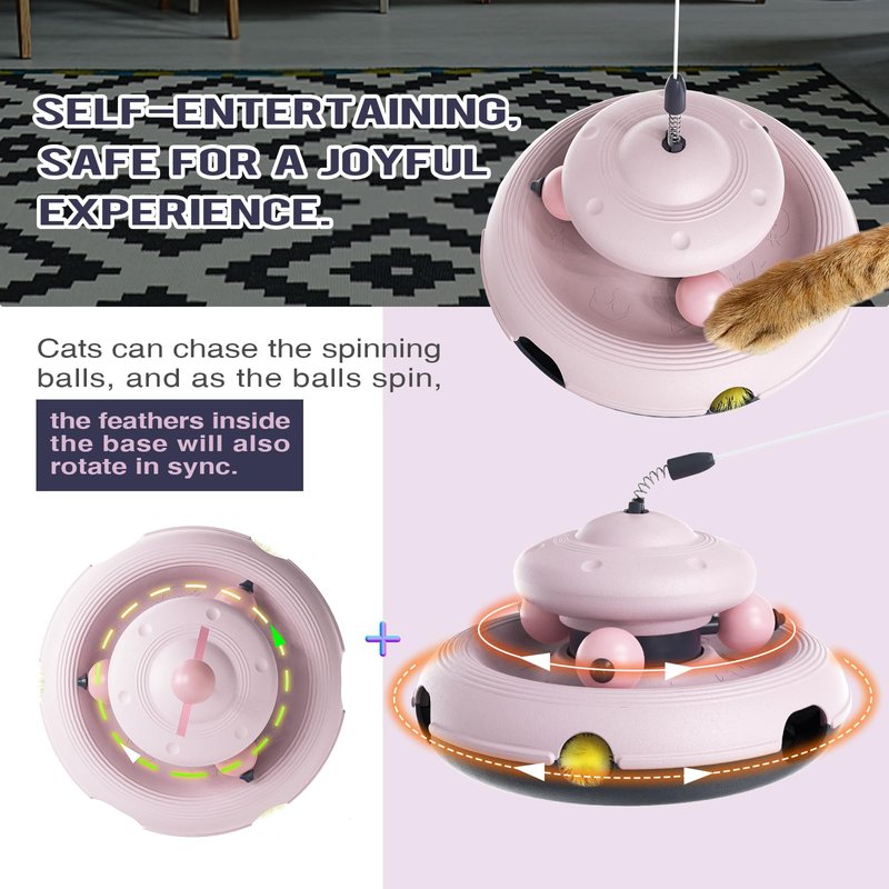 - 【The perfect toy for multi-cat households】 Cat toy is designed for multiple cats to play together. It features a central track with 3 plastic balls that cats can chase as they spin. As the balls spin, feathers inside the base rotate as well, peeking out to attract the cats' attention and increase their interest in play. If there are two cats in the household, one can play with the teaser wand or track balls while the other plays with the feathers.