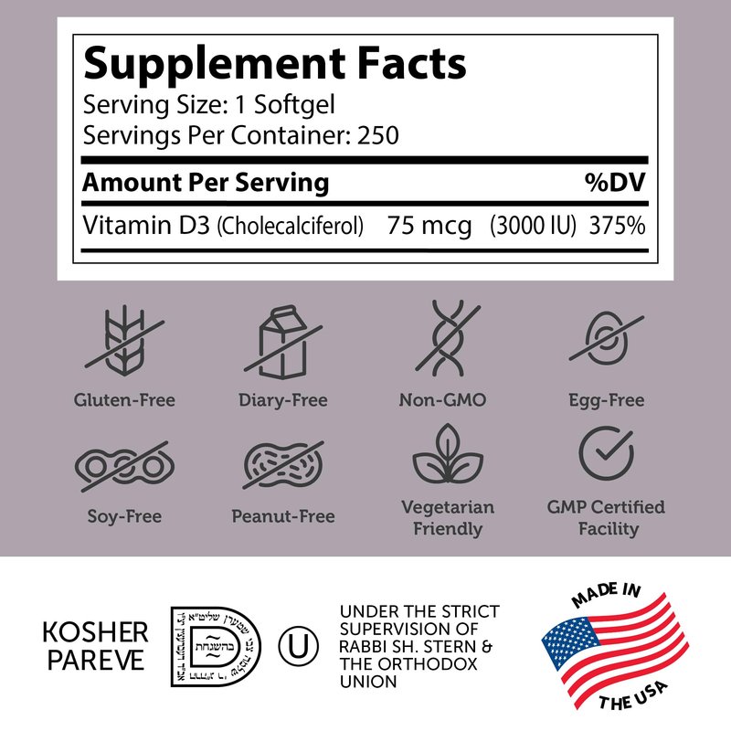 Zahler - Advanced Vitamin D3 3000 IU Softgels (250 Count) Kosher Vegetarian Friendly Vitamin D for Immune Support, Bone, Teeth & Muscle Health - Daily D3 Vitamin Supplement for Adults - Easy Swallow V