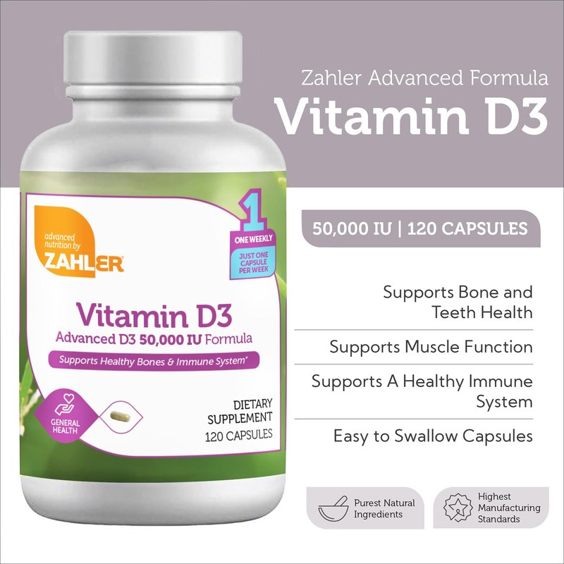 Zahler - Advanced Vitamin D3 50000 IU Softgels (120 Count) Kosher Vegetarian Friendly Vitamin D for Immune Support, Bone, Teeth & Muscle Health - Weekly D3 Vitamin Supplement- Easy Swallow VIT D 3