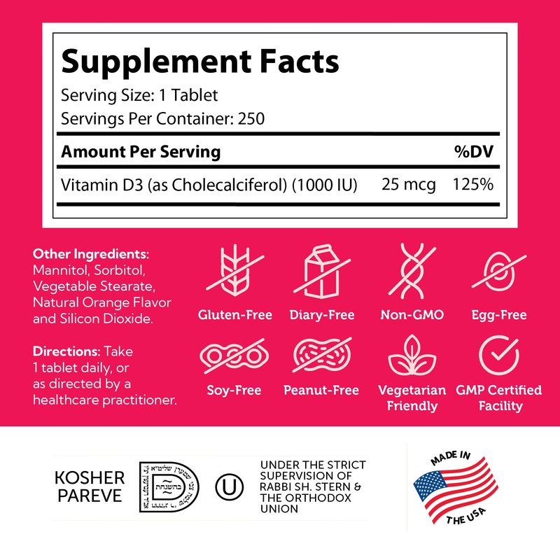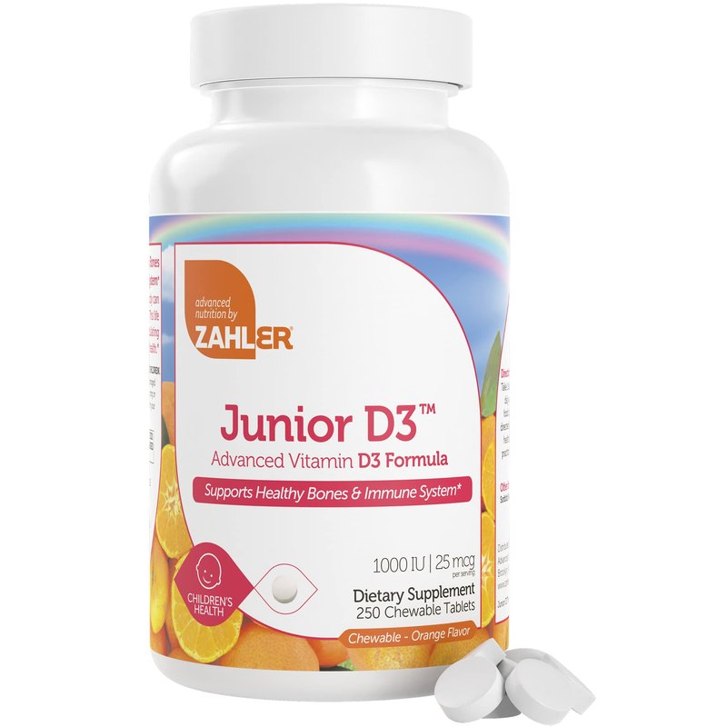 Vitamin D3 deficiency can affect adults and children all year long, but is often at its worst during the fall, winter and early spring when sunlight is scarce and the weather is cold. Each orange flavored chewable D3 Junior tablet from Zahler contains 1000 IU of vital Vitamin D to help maintain proper levels year round.