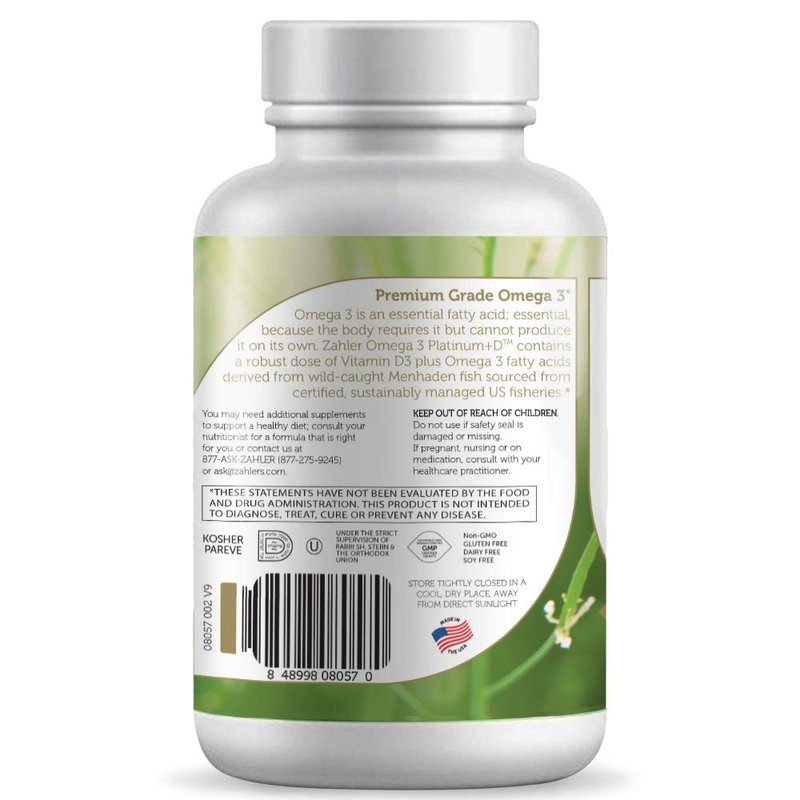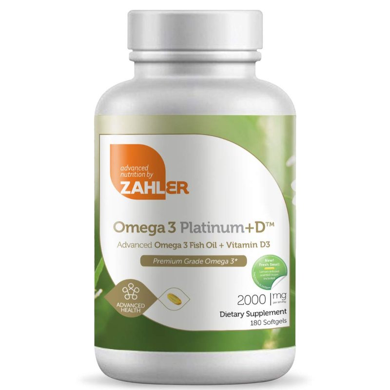 Zahler’s Omega 3 Platinum +D, a premium grade advanced Omega 3 with Vitamin D. Omega-3 is an essential fatty acid (EFA); essential, because the body requires it but cannot produce it on its own. Omega 3’s benefits come primarily from DHA (docosahexaenoic acid) and EPA (eicosapentaenoic acid). With a super-high concentration and the optimal 3:2 ratio of EPA/DHA, plus a robust dose of Vitamin D, Zahler Omega 3+D Platinum is the most effective supplement for people who do not get adequate levels of vitamin D and omega-3 faddy acids via their regular diet.