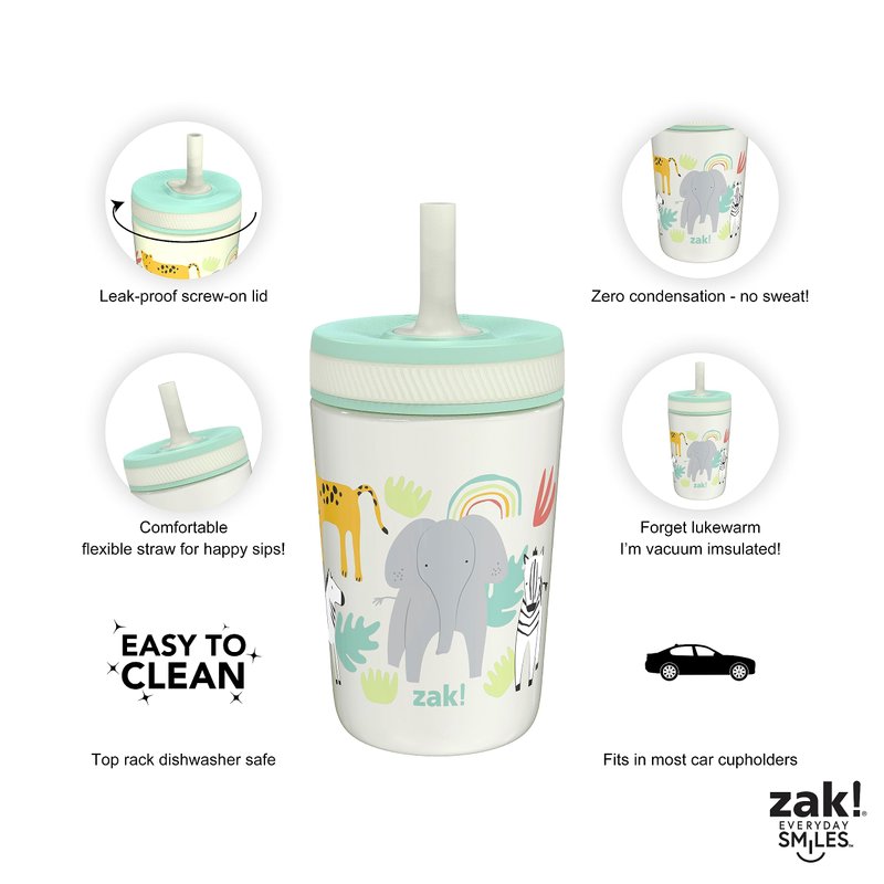 Zak Designs Kelso Toddler Cups For Travel or At Home, 12oz Vacuum Insulated Stainless Steel Sippy Cup With Leak-Proof Design is Perfect For Kids (Safari)