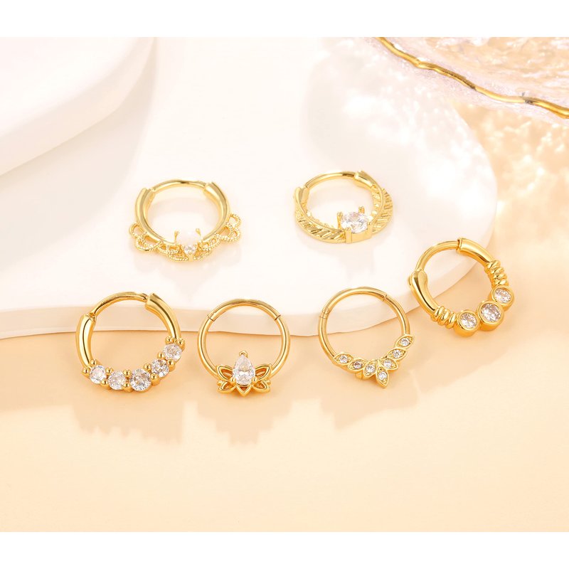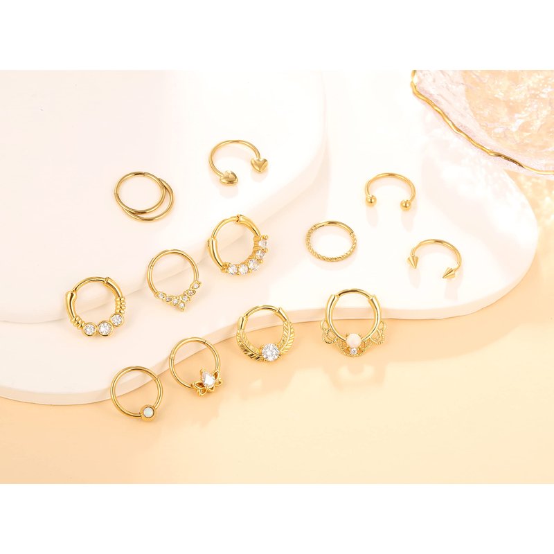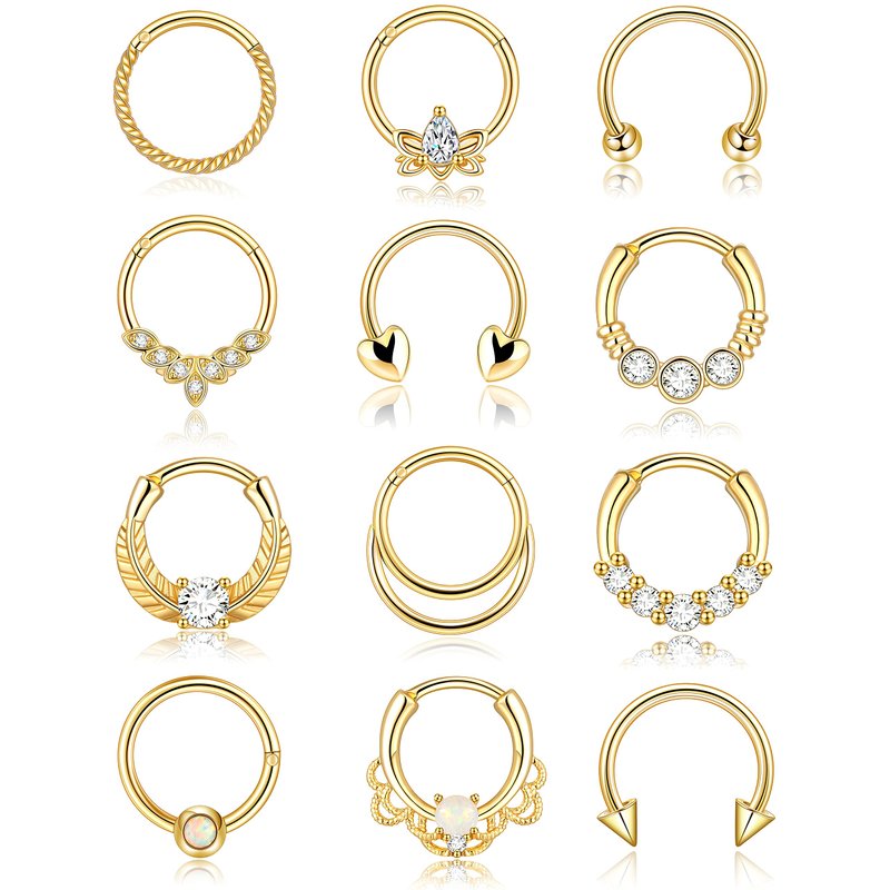 - 12 STYLES IN ONE ORDER - Get 12 different styles of nose rings with just one order! These gold septum clickers are perfect for daith, septum, nostril, cartilage, helix, tragus, conch, and rook piercings. Mix and match to create endless unique looks.