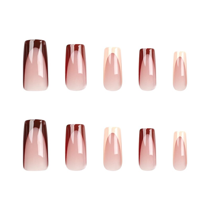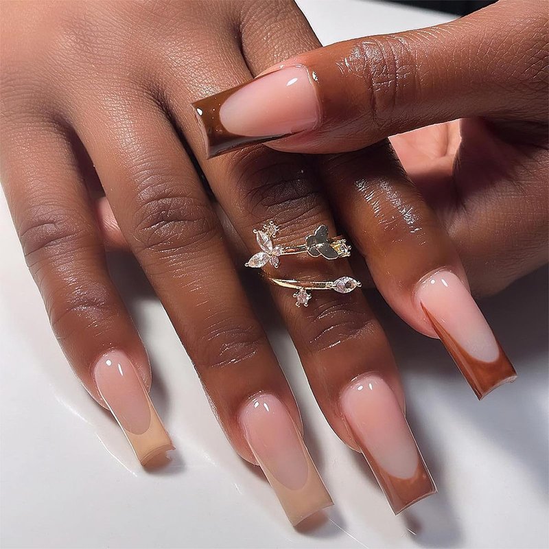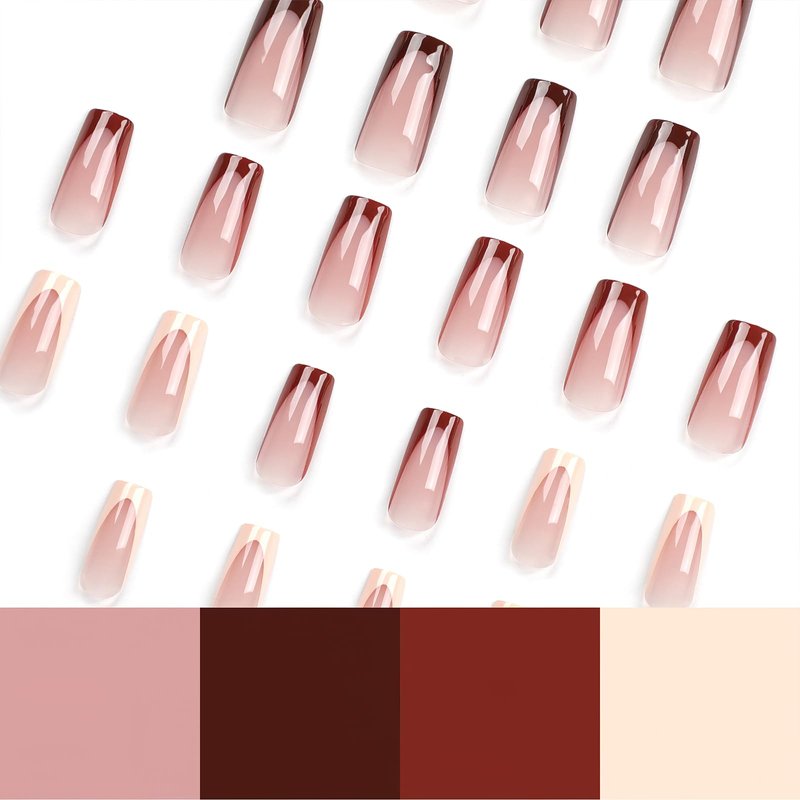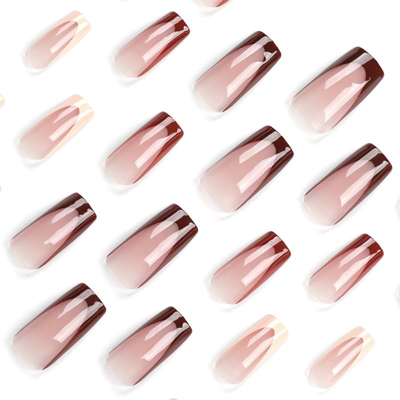 - 【PACKAGE INCLUDED】24pcs brown french tip false nails, jelly glue, a wooden stick. (Jelly glue is not as durable as liquid glue, but it makes the false nails reusable. Please use suitable glue according to different scenes.)