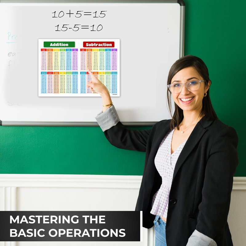 Our 8.5 inch x 12 inch Laminated Math Chart is the perfect educational tool for kids and teachers alike. Made with thick premium cardstock and laminated with tear-resistant, dry erasable, and water-resistant material, this math chart is built to last. The chart includes multiplication, division, addition, and subtraction charts from 0 to 12, making it a comprehensive resource for learning basic math facts. The vibrant color scheme adds to the engaging and stimulating design, capturing kids' attention and making learning fun. Measuring at a compact 8.5 inches x 12 inches, the chart is perfect for slipping into a folder or binder, making it a convenient and portable tool for learning on-the-go. Its small size also means it won't take up much space on your classroom wall or at home. This math chart is not just for students, it is also an essential tool for teachers. As a perfect addition to your classroom supplies, this chart is a convenient reference for math facts during lessons and is ideal for individual student practice. The chart's inclusion of multiplication tables, addition tables, division tables, multiplication chart, division chart, addition chart, and subtraction chart makes it a versatile tool for learning and practicing essential math facts. This makes it an ideal resource for students at any level, from elementary to middle school.