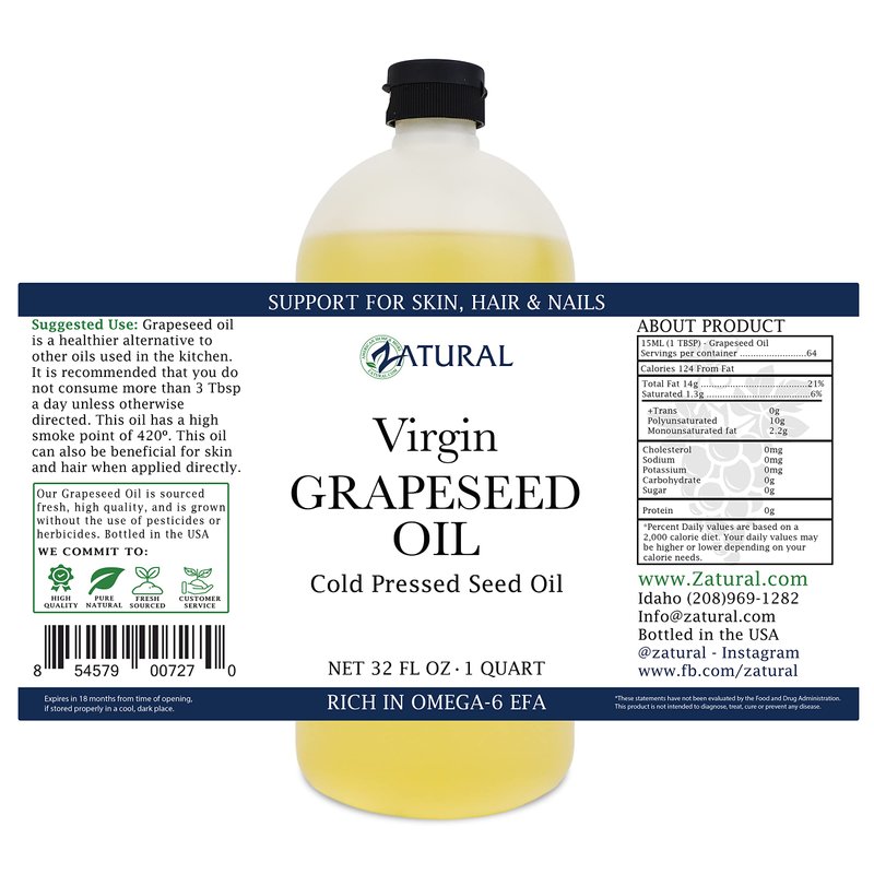 Zatural Grapeseed Oil Organically Grown 100% Pure Cold Pressed Virgin High Tempurature Cooking Oil (32oz)