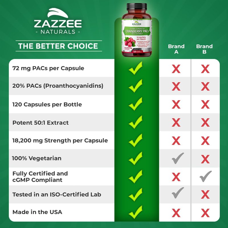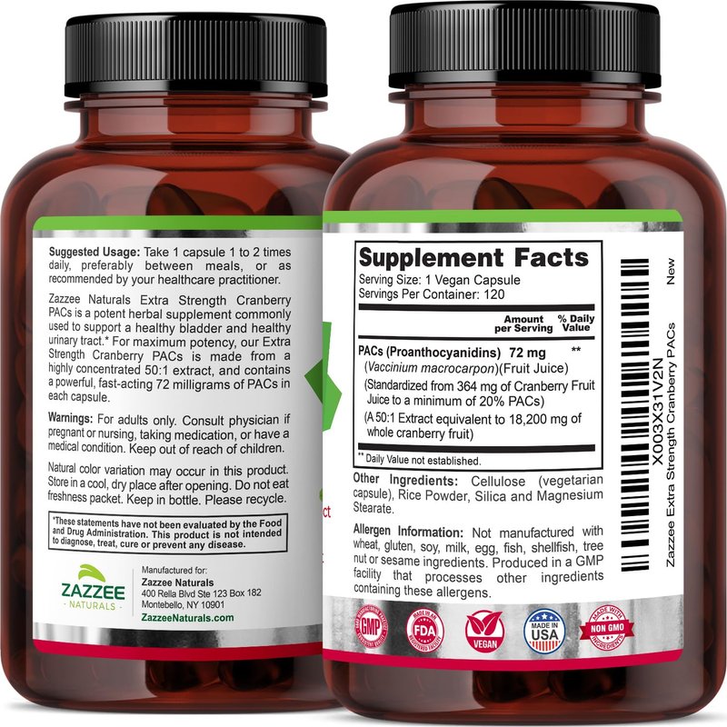 Zazzee Naturals Extra Strength Cranberry PACs provides 72 mg of PACs per capsule AND contains 120 capsules per bottle -- the strongest dosage and best value available!