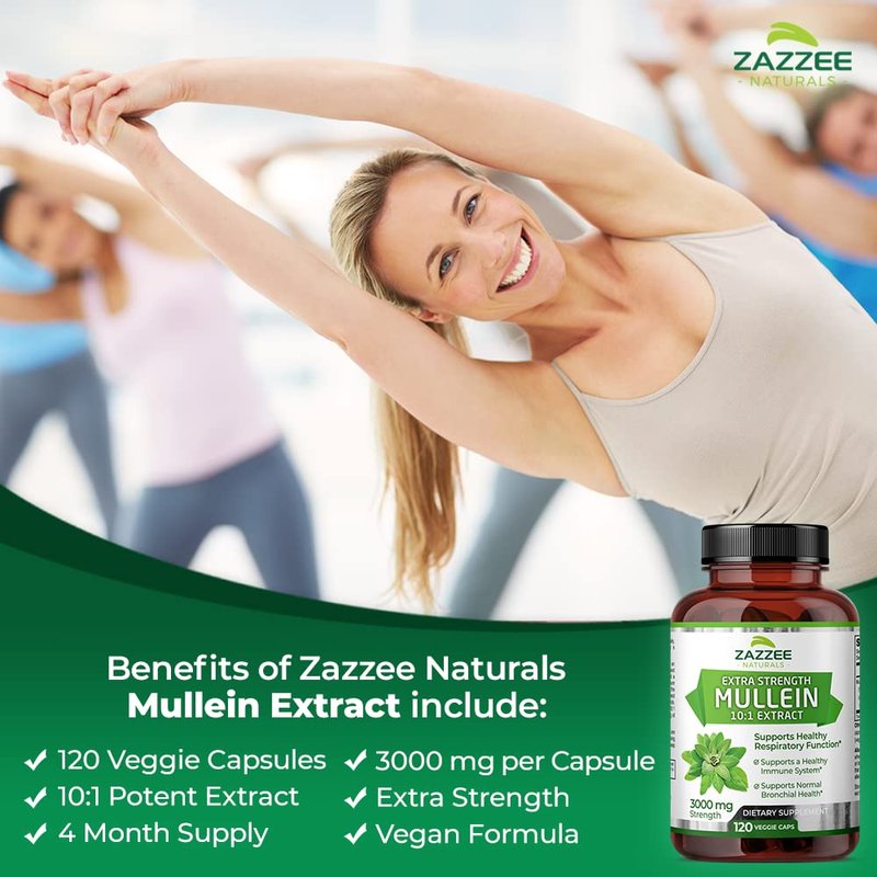 Zazzee Extra Strength Mullein 10:1 Extract, 3000 mg Strength, 120 Vegan Capsules, 4 Month Supply, Concentrated and Standardized 10X Extract, 100% Pure Leaf Powder, All-Natural and Non-GMO