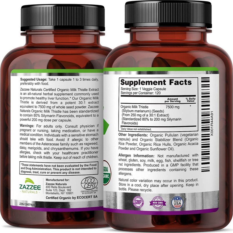 - USDA CERTIFIED ORGANIC: Any Milk Thistle that is not CERTIFIED organic can be highly contaminated and even toxic to your liver. With Zazzee Naturals Certified Organic Milk Thistle, you can be sure your Milk Thistle is organic, all-natural, vegan, and non-GMO. More, while other competing products use various chemicals as fillers, binders, and excipients, our Organic Milk Thistle instead uses a unique Organic Stabilizer Blend.