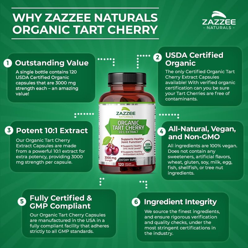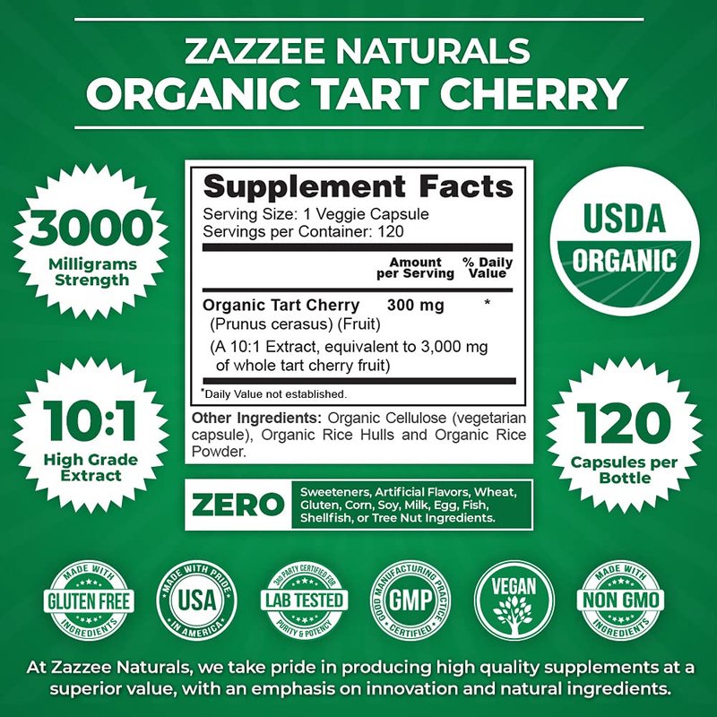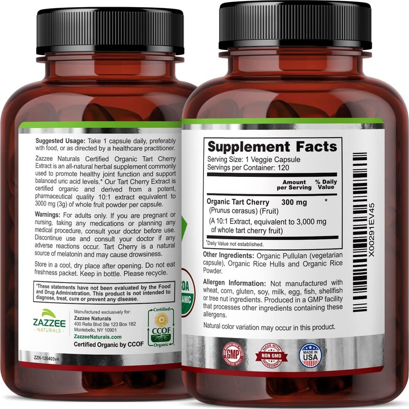 - USDA CERTIFIED ORGANIC: With Zazzee Naturals USDA Certified Organic Tart Cherry Extract, you can be sure your Tart Cherry Capsules are organic, all-natural, vegan, and non-GMO. More, while other competing products use various chemicals as fillers, binders, and excipients, our Organic Tart Cherry Extract instead contains only all-natural, organic stabilizers.