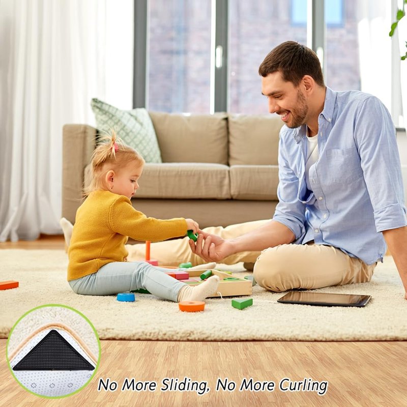 - Anti Curling Non Sliding - Are you fed up of sliding rugs or rug corners interfere when you walking? Are you worry about that the elderly and kids tripping over rug edges, pets playing with area rugs? These adhesive rug stickers can fix all these problems immediately. It has strong stickiness that can hold the carpet flat and keep it in place firmly.