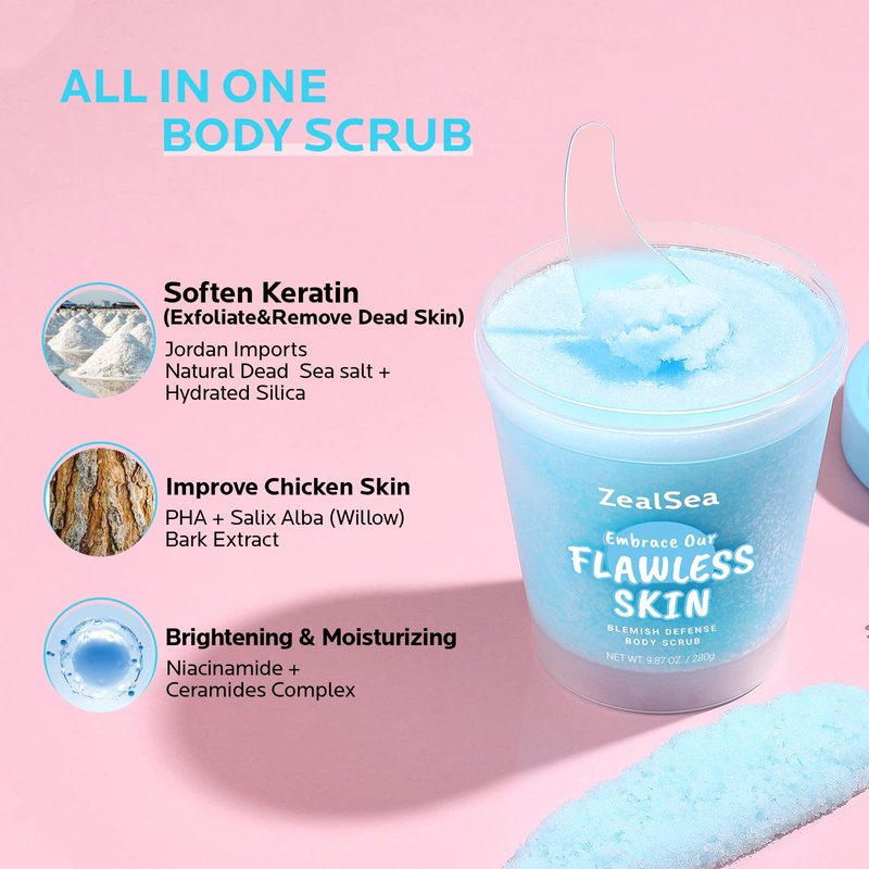 - EXFOLIATOR BODY SCRUB: Microdermabrasion body scrub with Dead Sea Salt, Salix Alba (Willow) Bark Extract and Niacinamide can buff away foot, hand, legs and body dead skin, Improve the strawberry skin and chicken skin. As a natural exfoliator and moisturizing to brighten skin and reveal fresher healthier clear skin.