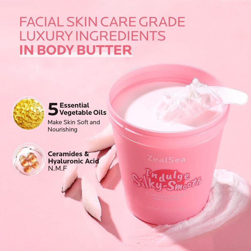 - MOISTURIZING BODY BUTTER: Body butter cream is loaded with Ceramides & Hyaluronic Acid and Five Essential Vegetable Oils such as Shea Butter, Coconut Oil and so on. They can help the skin absorbs quickly with a non-greasy feel, restores the barrier between your skin and the outside environment, holding moisture in. To leave your skin feeling silky smooth to the touch.