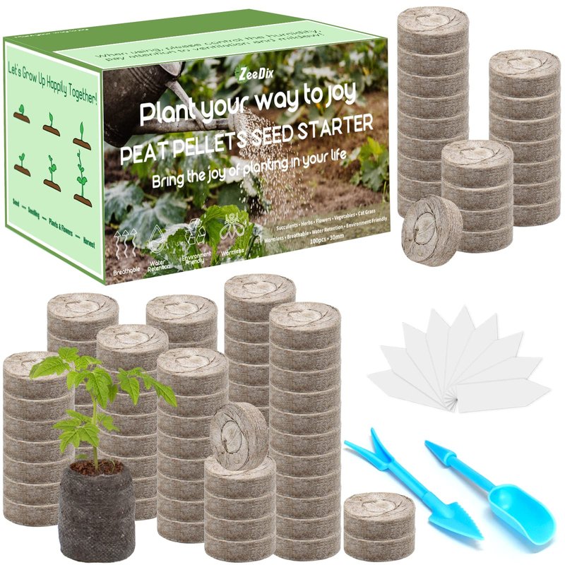 ZeeDix 100 Pcs 30mm Peat Pellets Seed Starter Soil Pods Plugs for Vegetable Seedling, Compressed Peat Nutrient Pods for Planting Easy Transplant with 100 Plant Labels & 2 Garden Tools