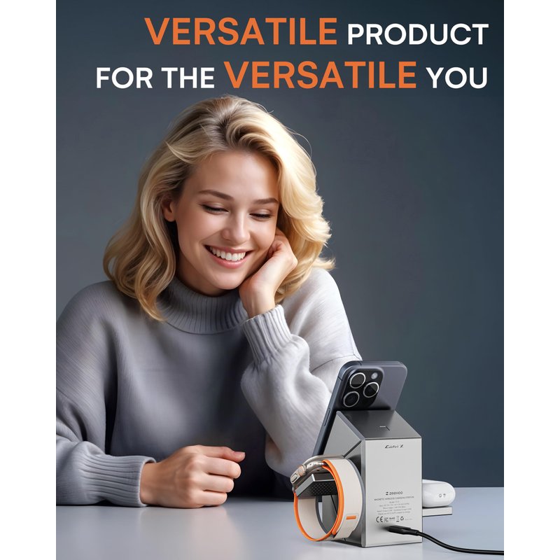 ZEEHOO 3 in 1 Charging Station for Apple MagSafe Charger, CubeTrick-X Qi2 15W Fast Wireless Charger Stand for Apple Watch, for iPhone 16,15,14,13,12 Series, AirPods (Metal Gray)