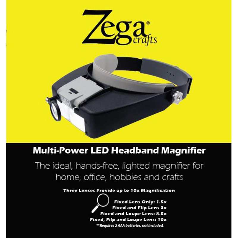 - The Zega headband magnifier provides three acrylic, multi-depth, magnifying lenses, each with a rigid coating designed to protect against cracking. Two of the lenses offer 1.5X magnification and the third offers 7X magnification, providing magnifying intensities at multiples of 1.5, 3, 8.5 and 10.