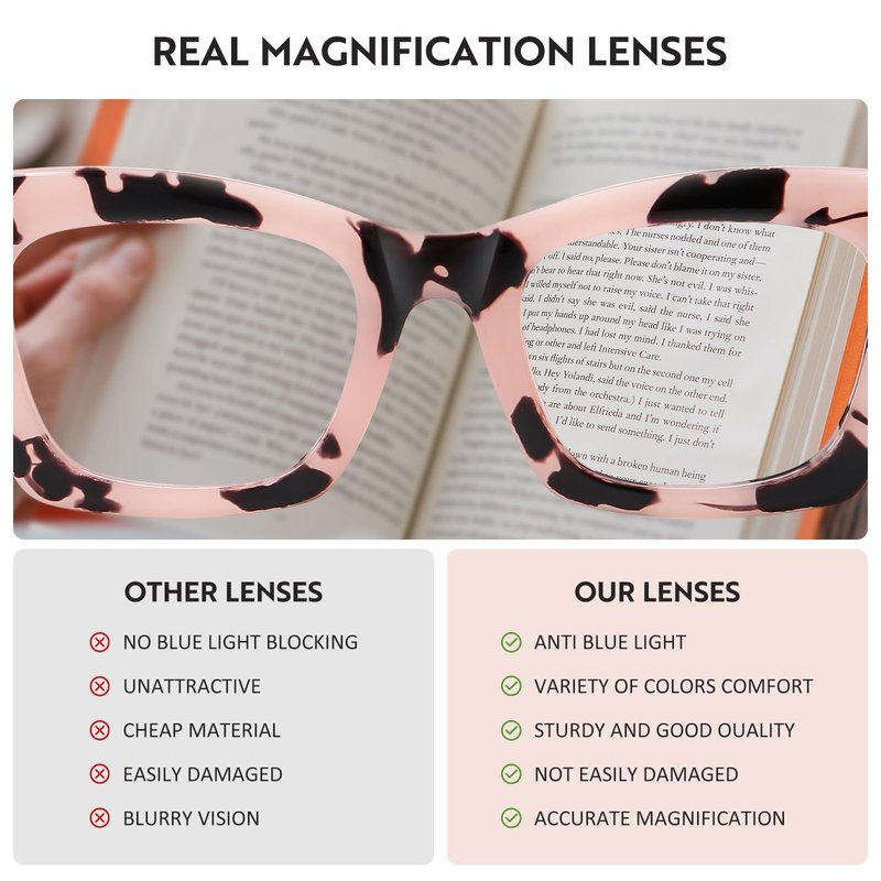 - [ High-Quality Lenses ] - Accurate magnification strength makes useful vision zone increases .The lenses are clearer than the normal ones and have higher precision as well, restore the true color ,anti blue light and uv400 lenses can filter harmful blue ray & uv glare, bring you a clear vision and bring the best reading experience.