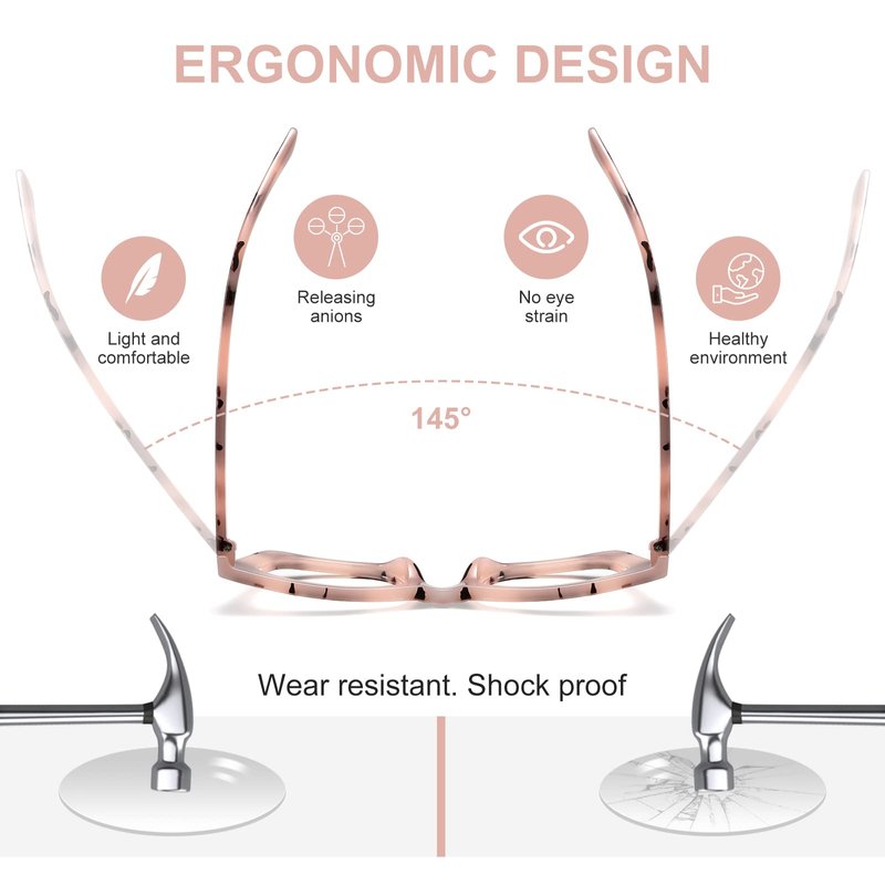 - [ Ergonomic Design ] - Our reading glasses is made of durable polycarbonate,extra light polycarbonate frames that are scratch resistant, skin-friendly nose pads, anti-slip and comfortable to wear, accommodate all face shapes.