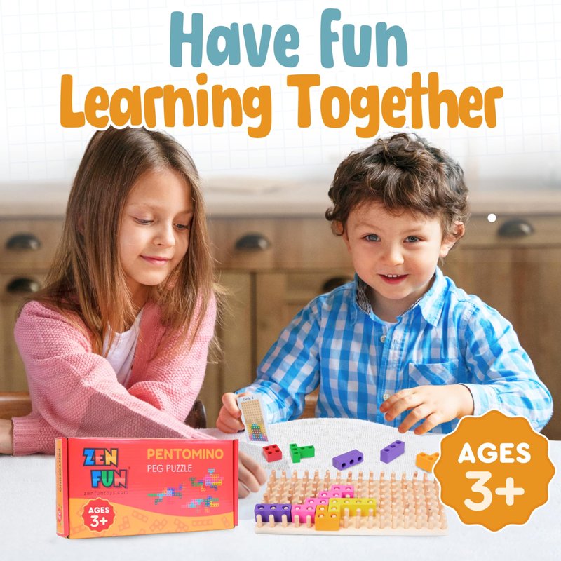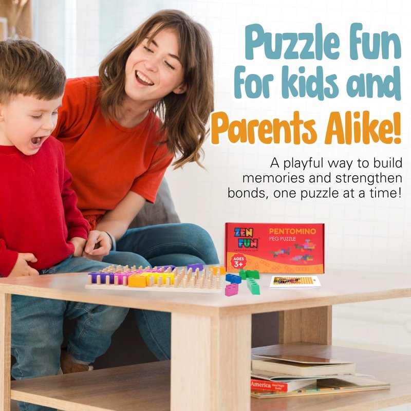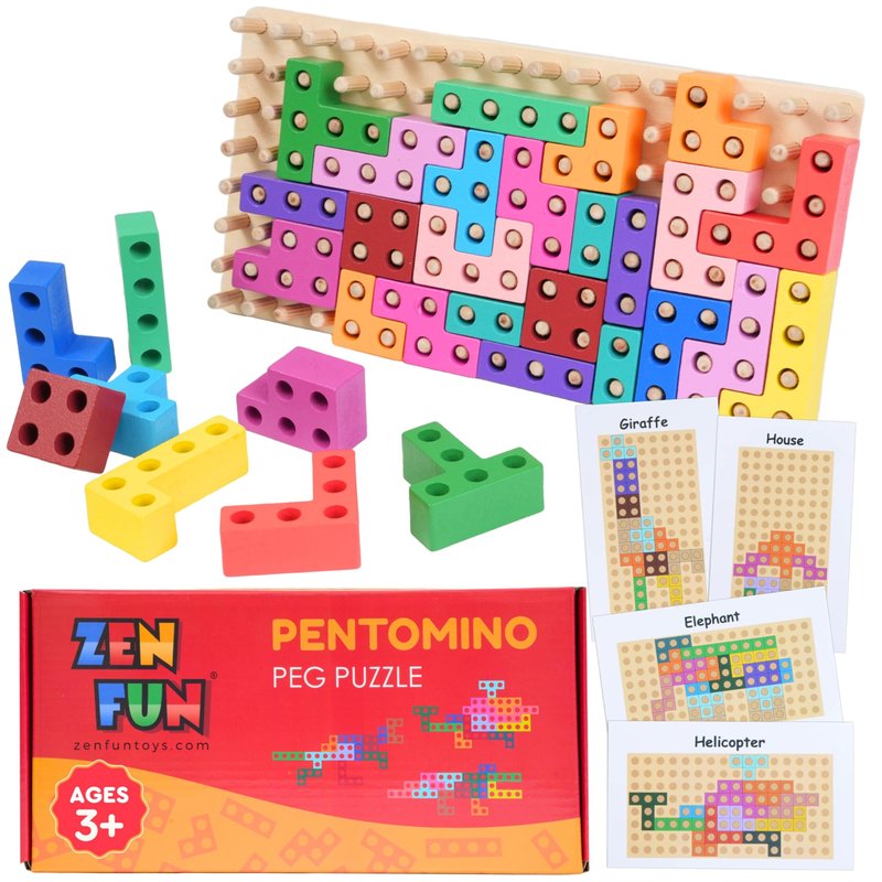 Zen Fun Pentomino Peg Puzzle - Wooden Pattern Blocks for Kids, Tangram and Montessori Puzzle, Animal Tetris Board Game for Kids, Wooden Puzzles for Kids Ages 4-8 - (32 Pieces)