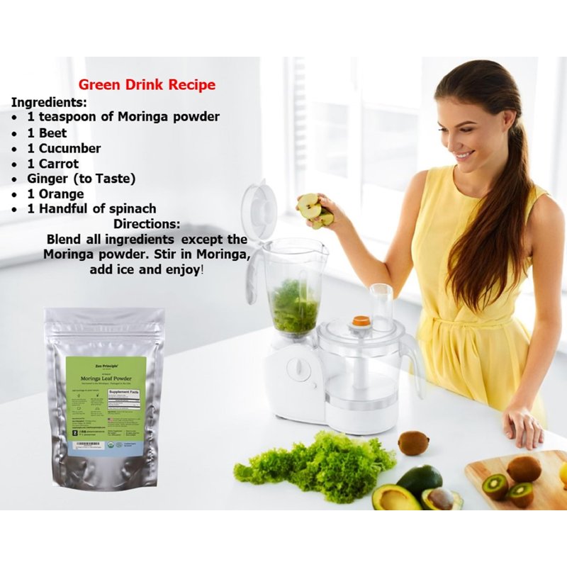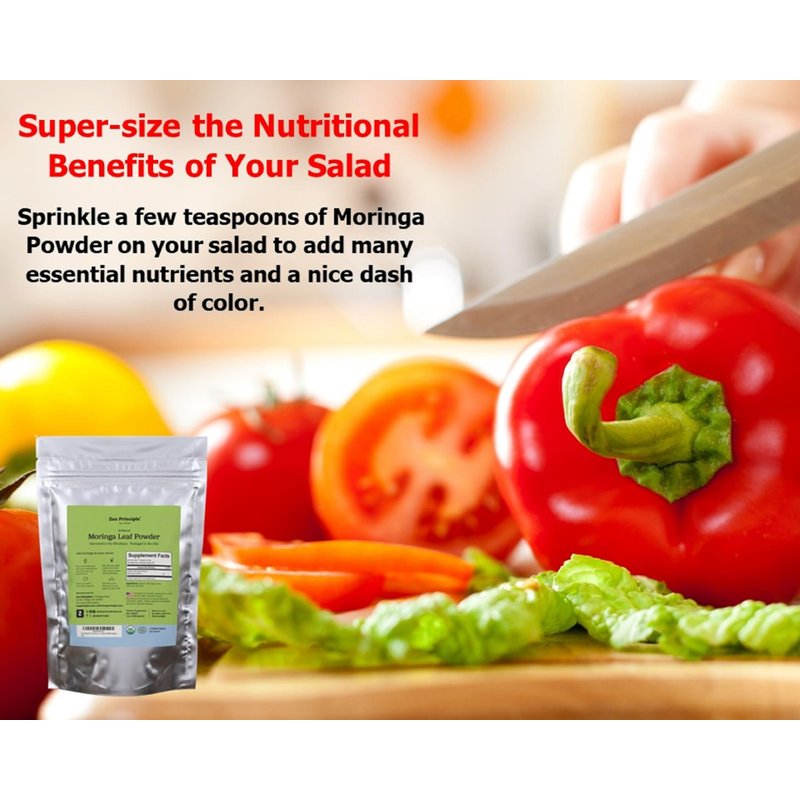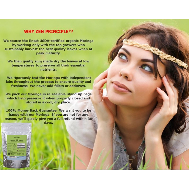 WHY BUY FROM ZEN PRINCIPLE? We Source the Finest Moringa. We only work with the top growers who sustainably harvest the leaves when at peak maturity. We then gently dry it at low temperatures to preserve all key nutrients. We Rigorously Test the Product. Our Moringa is tested by independent labs throughout the process to ensure quality and freshness. We also never add fillers or additives. Resealable Mylar Bag. Our Moringa comes in handy stand-up bags which help preserve it when properly closed and stored in a cool, dry place. NOTE: MORINGA OLEIFERA IS A MILD LAXATIVE, START WITH 1/2 TEASPOON PER DAY TO LET YOUR BODY ADJUST! MORINGA ALSO WILL NOT DISSOLVE IN HOT OR COLD WATER, SO YOU’LL WANT TO STIR YOUR DRINK ONCE OR TWICE WHILE ENJOYING IT. MORINGA TEA HAS A STRONG HERBAL TASTE; SOME PEOPLE MAY PREFER ADDING TO A DRINK OR SHAKE INSTEAD OF A TEA.