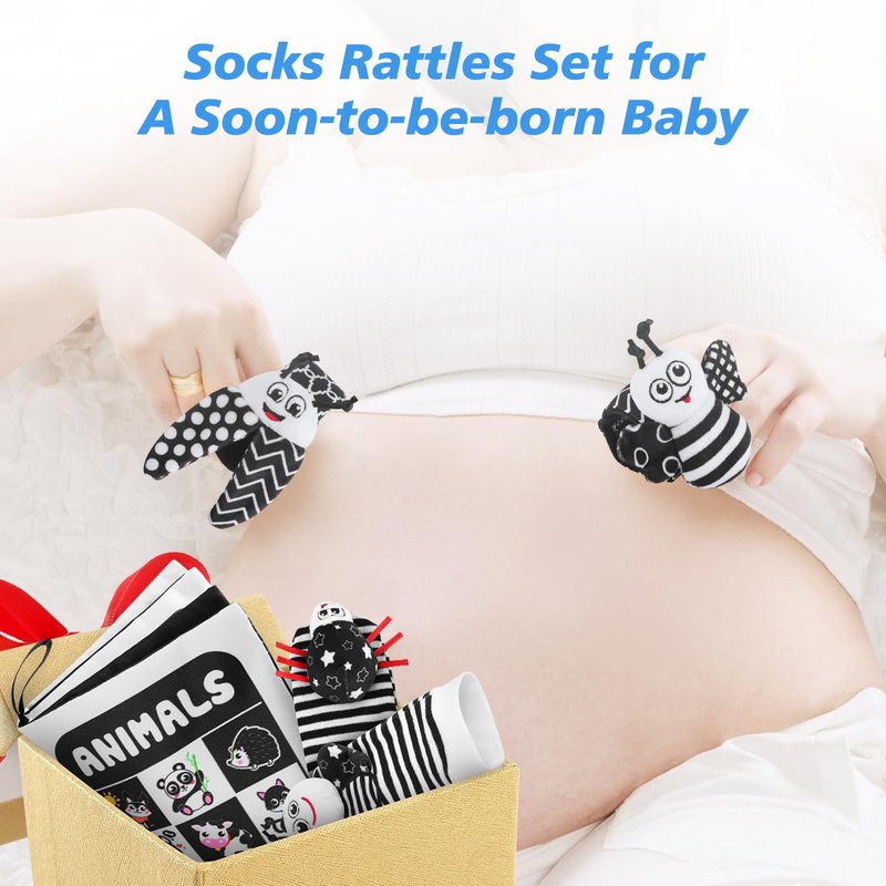 Baby Toys 0-12 Months: Black and White Sensory Toys Baby Socks & Wrist Rattles Newborn Toys with Baby Cloth Book Kits, High Contrast Baby Gifts for Boys Girls