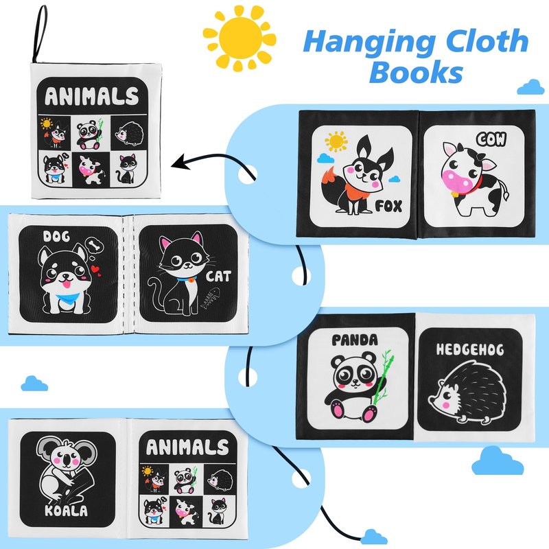 - High-contrast Sensory Toys: Black and white high-contrast baby toys help stimulate the development of the retina and optic nerve, gradually training and activating the brain. Sock rattles promote visual and auditory development in newborns, while animal books aid in early visual development and help improve cognitive abilities in infants aged 0-18 months