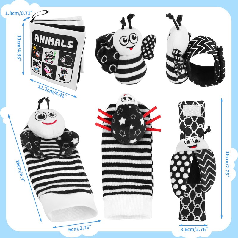 - Upgraded Black & White Toy Set: We have added an additional 1 pcs of Baby Cloth Book to the basic 4pcs Foot Finders&Wrist Rattles toys, increasing the product's age range from 0-6 months to 0-18 months, extending its lifespan and meet the needs of babies of different ages